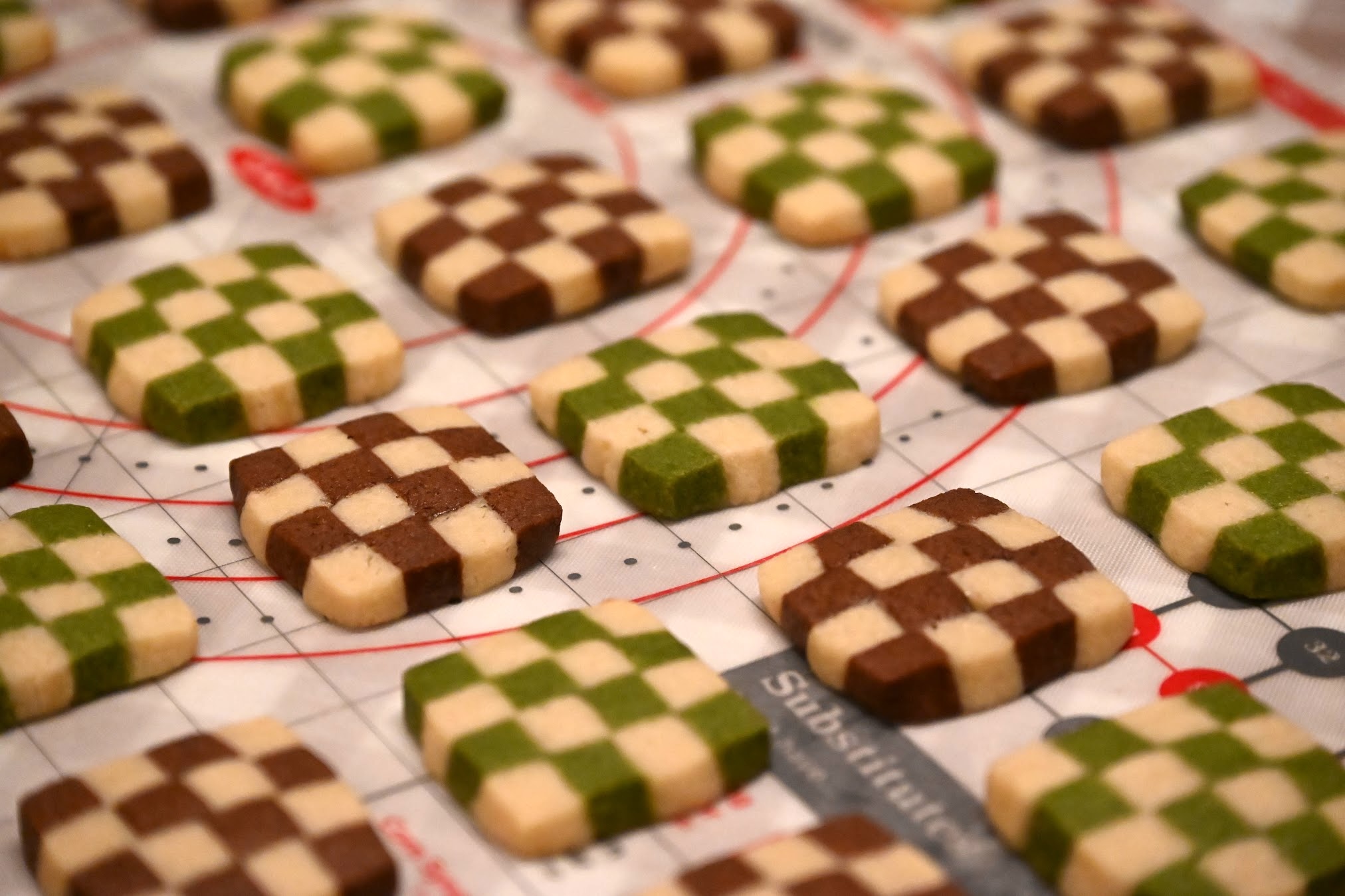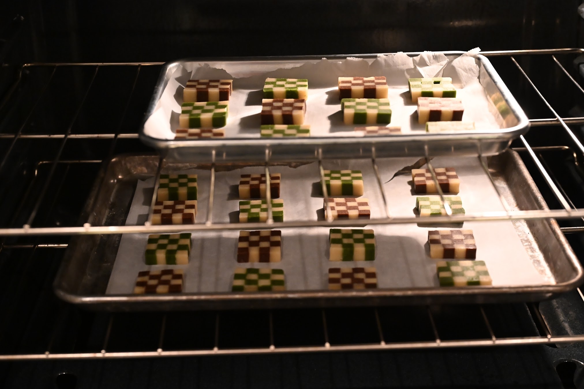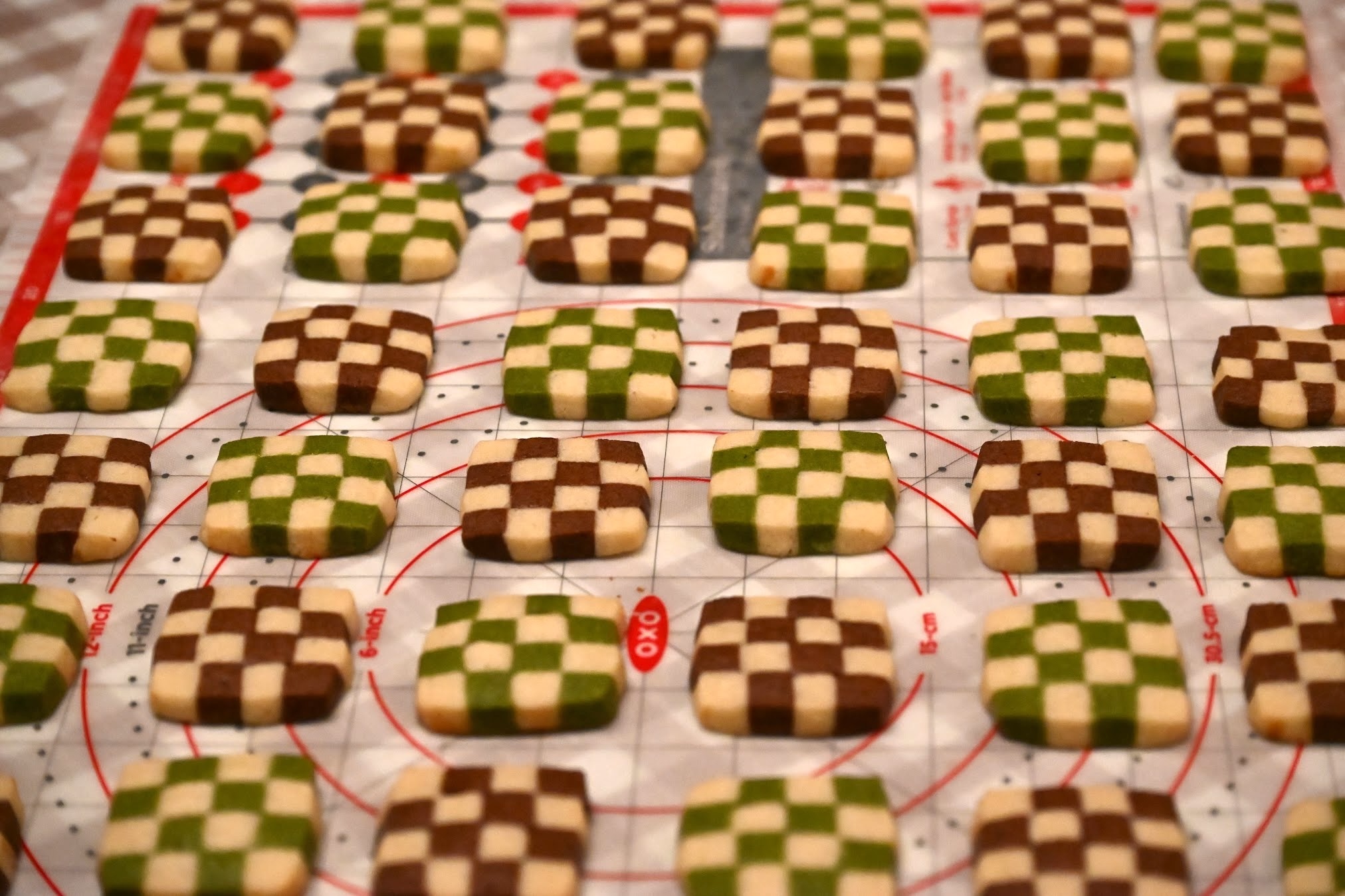 Dough Strip Preparation: The technique is not so hard - you just need good rulers and a pastry cutter. For the recipe, it's basically a shortbread dough (I use Sally's Recipe but substitute in two tablespoons of espresso powder or culinary matcha powder, and halve the sugar). The butter needs to be creamed very well in order to be soft though. Then comes a huge waiting game to flatten the dough to ~10 mm height, cut into 10 mm-wide strips, and to array the strip in a 'tuple style'.