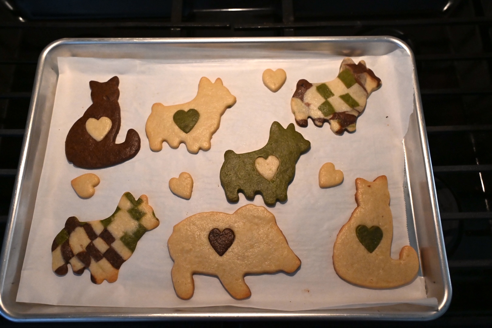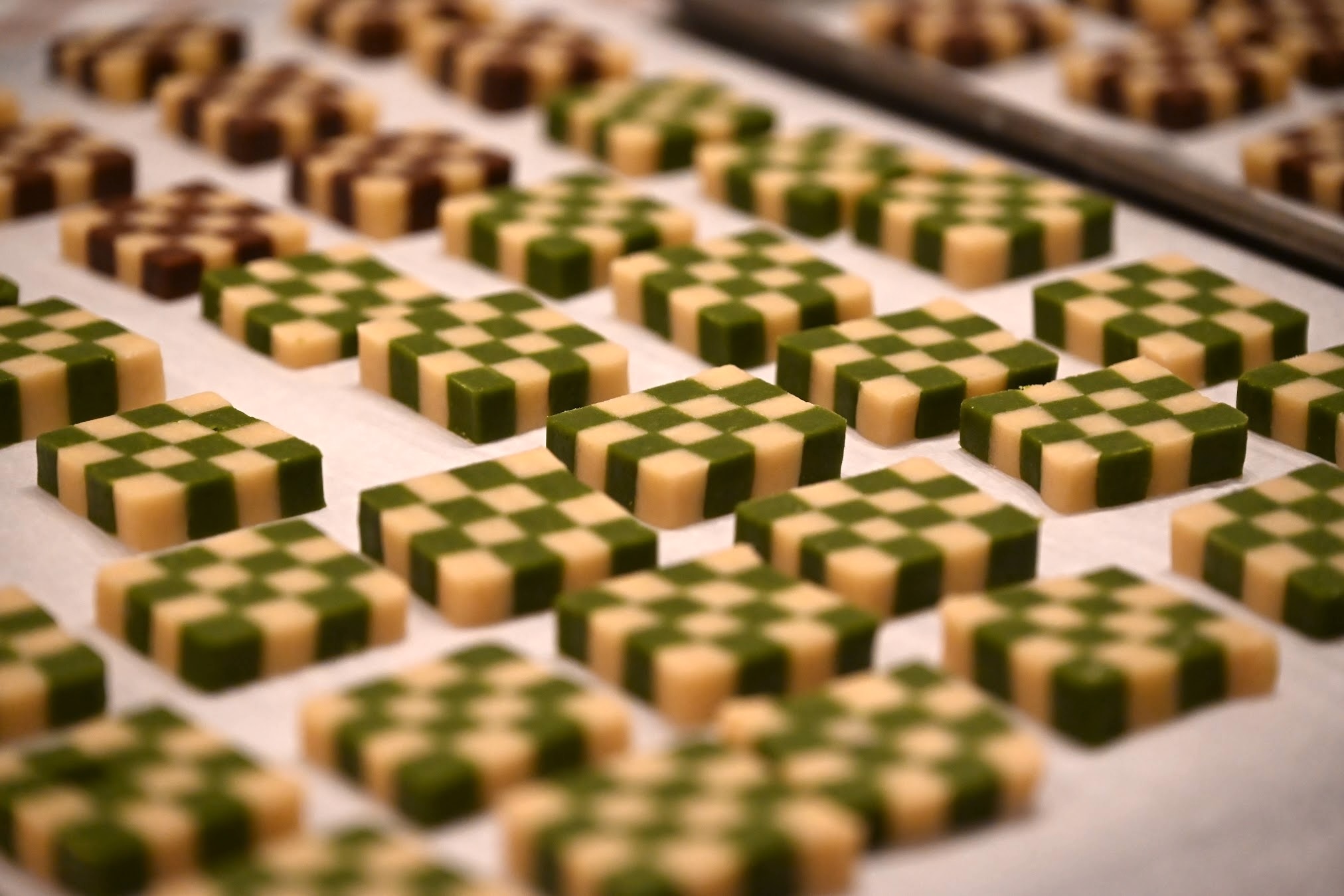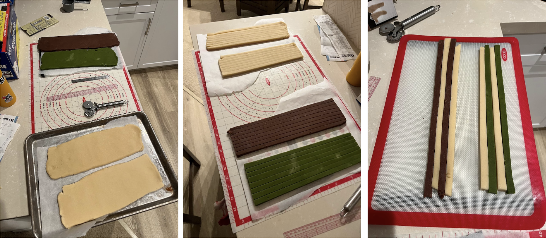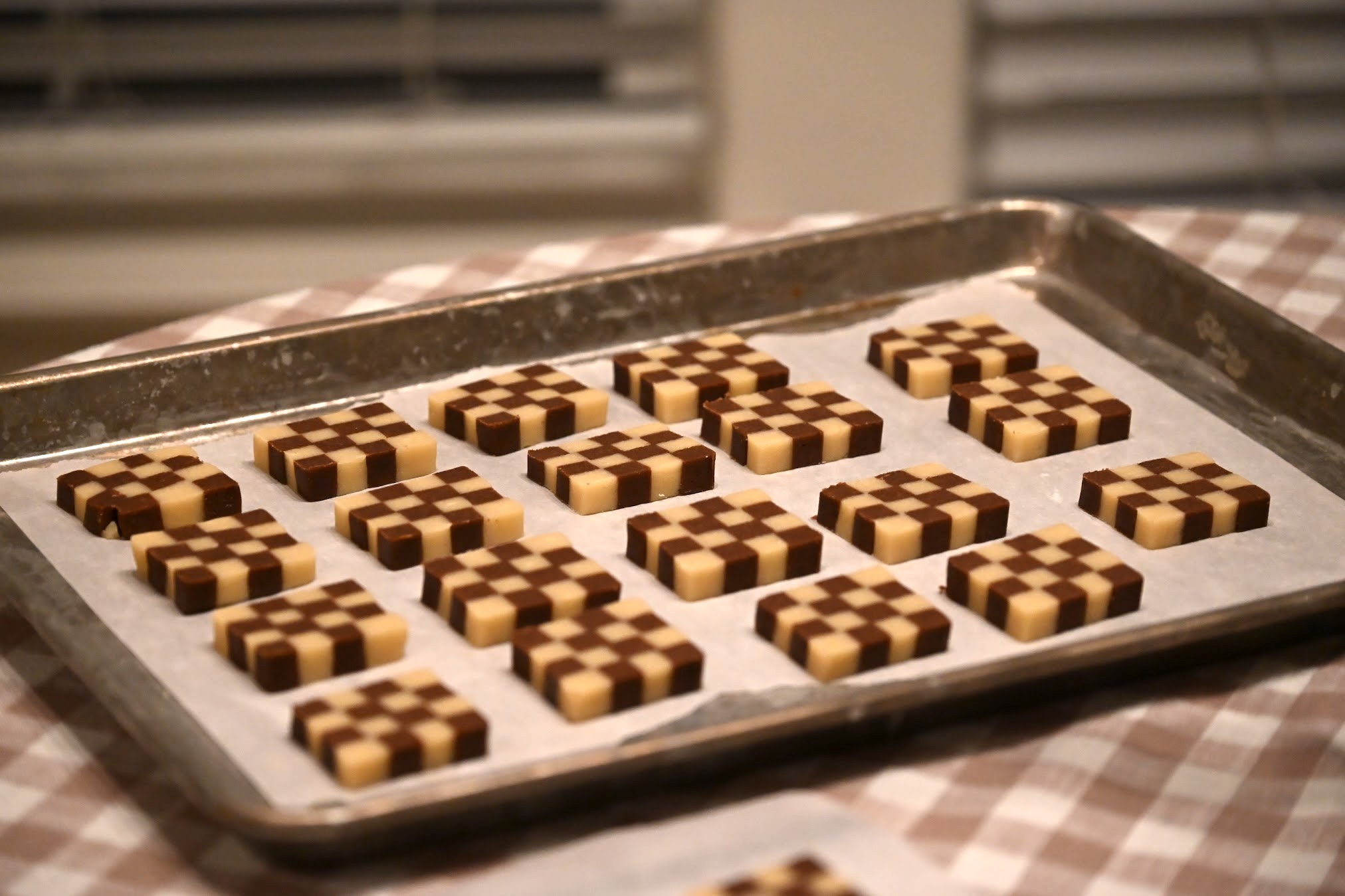 Dough Strip Preparation: The technique is not so hard - you just need good rulers and a pastry cutter. For the recipe, it's basically a shortbread dough (I use Sally's Recipe but substitute in two tablespoons of espresso powder or culinary matcha powder, and halve the sugar). The butter needs to be creamed very well in order to be soft though. Then comes a huge waiting game to flatten the dough to ~10 mm height, cut into 10 mm-wide strips, and to array the strip in a 'tuple style'.